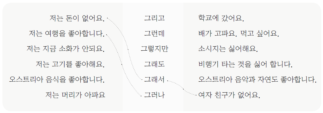 Wie auch im Deutschen gibt es im Koreanischen Konjunktionen, die einen selbstständigen Folgesatz (der mit der Konjunktion eingeleitet wird) in ein bestimmtes Verhältnis zum vorangegangenen Satz bringen: