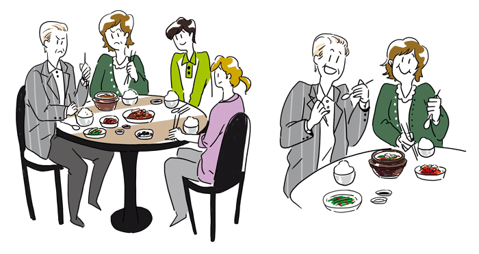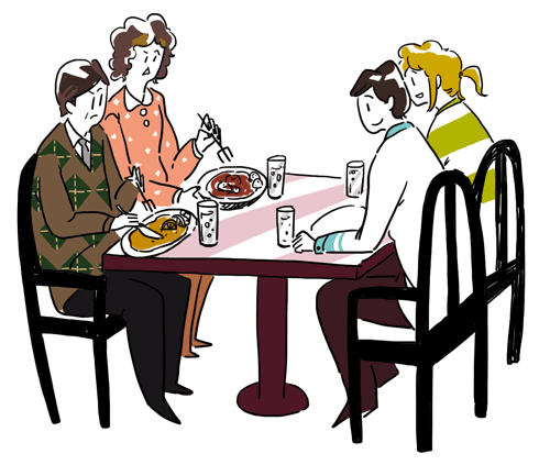 | H | 자, 아버님, 어머님, 무엇을 잡수시겠어요? 어떤 것을 주문해 드릴까요? |