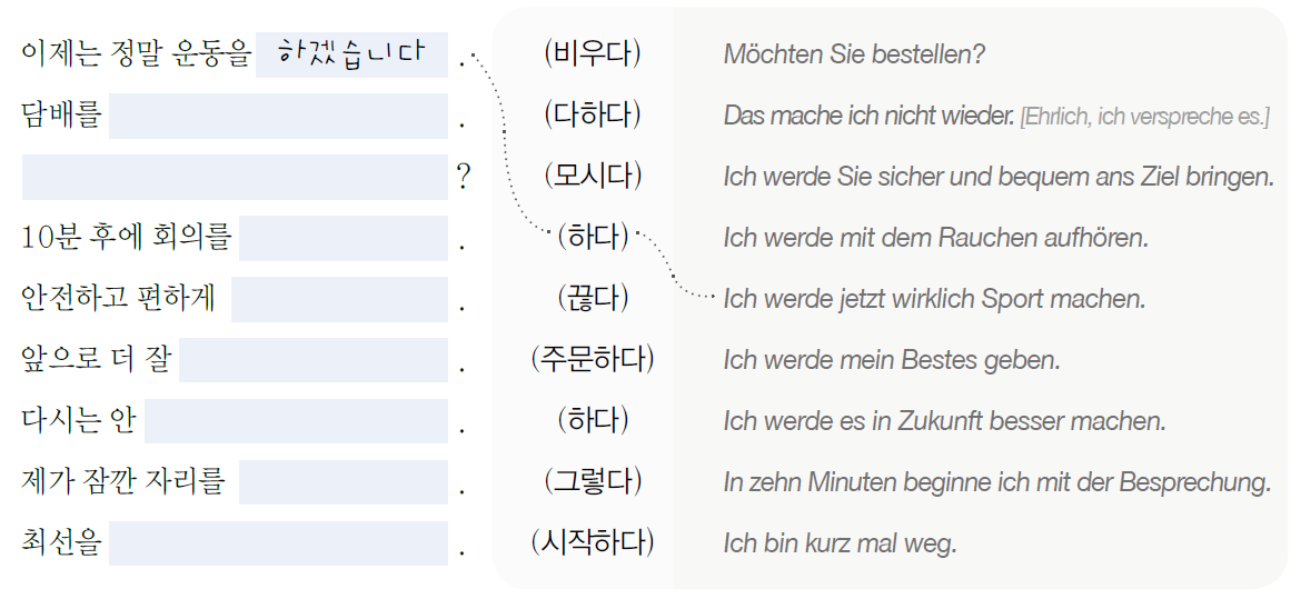 Hier geht beides! 제 소개를 할 것입니다. / 제 소개를 하겠습니다. 저는 미하엘입니다. Darf ich mich vorstellen? [Ich stelle mich jetzt vor.] Ich heiße Michael. 잊지 않을게요. / 잊지 않겠어요. Das werde ich nicht vergessen. 숙제를 내일 할게요. / 숙제를 내일 하겠습니다. Ich mache die Hausübung morgen. (Morgen mache ich die Hausübung bestimmt.) Q Wieso geht hier beides? A Ja, das Subjekt ist der Sprecher und er kann entweder die Futurform oder die Form, die in Richtung „Gelöbnis“ geht. Q Was soll das für ein „Gelöbnis“ sein, wenn jemand sagt “제 소개를 하겠습니다“? Das heißt doch bloß soviel wie „Ich werde mich jetzt vorstellen.“ Oder allenfalls „Ich bin so frei und stelle mich Ihnen vor.“ A Ja, aber das ~겠… lässt die Erklärung der Absicht („ich werde jetzt“, „ich gestatte mir jetzt“) beflissener und damit höflicher klingen.